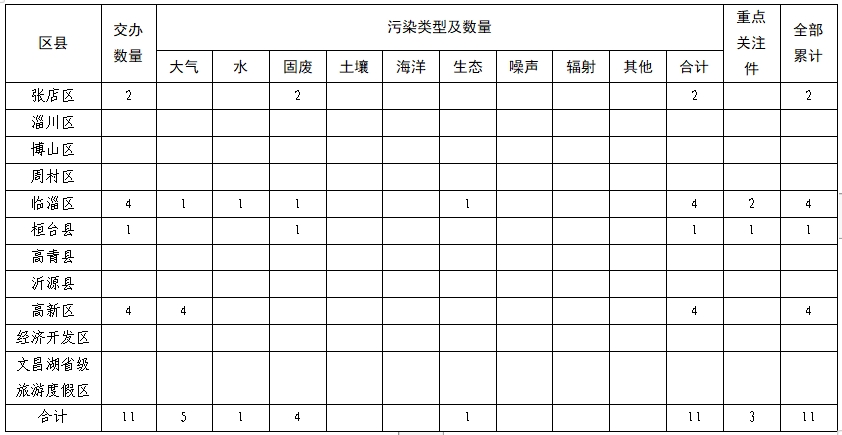 本批交办信访举报件共涉及4个区县(含功能区)。其中,张店区2件、临淄区4件、桓台县1件、高新区4件。