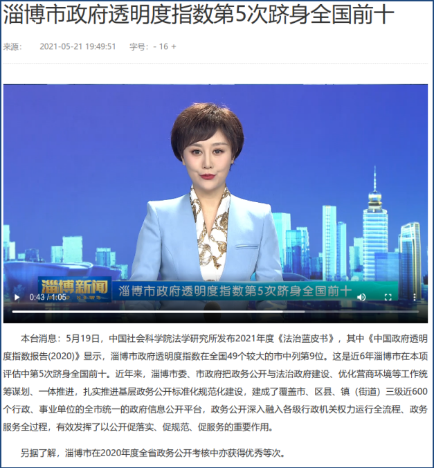2021年5月中国社会科学院法学研究所、社会科学文献出版社联合发布的《中国政府透明度指数报告(2020)》显示:买球下注官方网站政府透明度指数在全国49个较大的市中列第9位。